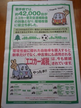 【盛岡】岩手県自動車販売店協会(吉田典雄会長)は、エコカー補助金終了後の販売減を見据え、県内のマスメディアを活用したキャンペーン活動に乗り出した。エコカー補助金が終了したことで購買意欲が減退しているユーザーに対し、エコカーへの買い替えを促...