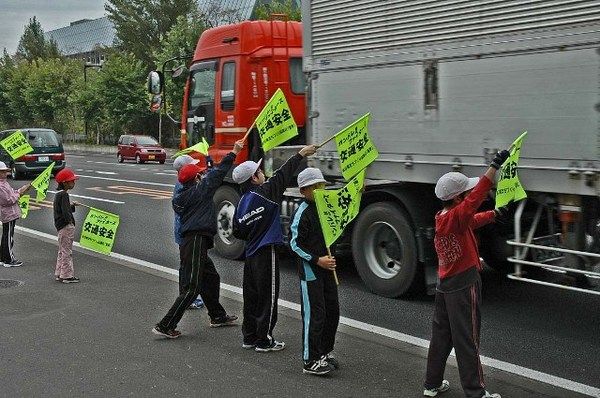 札幌市豊平区月寒の国道36号で15日、企業や団体など1100人参加の街頭啓発が行われた。月寒東1条12丁目から20丁目までの約2キロに、交通安全旗の波が広がった 東月寒地区町内会連合会が年1回実施しており、今回が4年目。同地域には札幌トヨ...