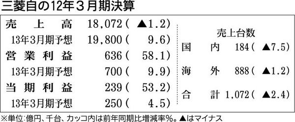 三菱自動車が26日に発表した2012年3月期連結決算は、売上高が前期比1・2%減の1兆8072億円、営業利益が同58・1%増の636億円となった。卸売台数の減少や円高の影響などで減収となったが、新型SUV投入など車種構成の改善や資材費など...
