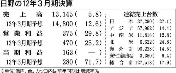 日野自動車は26日、2012年3月期連結業績で純利益が163億円となり、4期ぶりの最終黒字に転換したと発表した。売上高は前年比5・8%増の1兆3145億円となり2期連続で増収、営業利益は同29・8%増の375億円となり3期連続での営業増益...