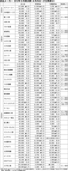 部品メーカーの2012年3月期決算は、4月27日までにトヨタグループやホンダ系などが発表を終えた。本紙が集計した34社の決算は、東日本大震災やタイの洪水の影響により、約半数の18社が減収だった。利益は9割にあたる30社が営業減益、25社が...