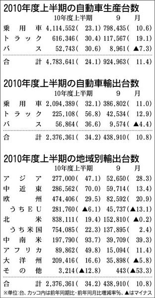 日本自動車工業会(自工会、志賀俊之会長)は29日、2010年度上半期(4~9月)の生産・輸出実績を発表した。生産は前年同期比24・1%増の478万3641台と、2年ぶりのプラスとなった。エコカー補助金制度の効果を受けて国内販売が増加した点...