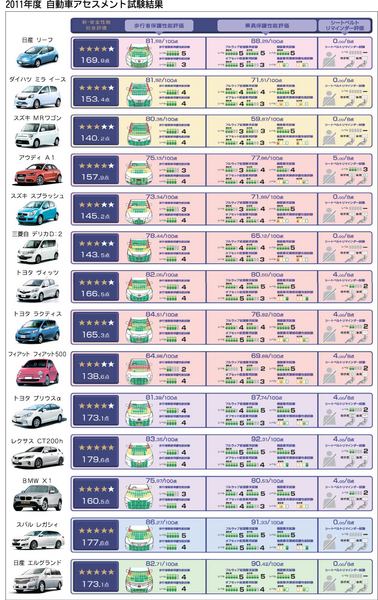 国土交通省は、2011年度の自動車アセスメントの結果を公表した。ディーラーなどで購入した車両に各種の衝突テストを実施し、結果を総合得点と星の数(最高五つ)で評価するもの。今回は電気自動車1車種、軽自動車2車種、乗用車10車種、ワンボックス...
