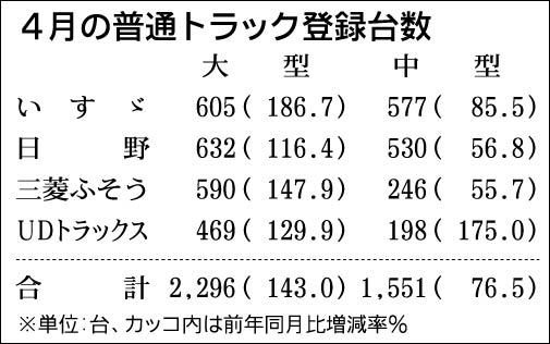 業界筋がまとめた4月の普通トラック(積載量4トン以上)販売は、前年同月比110・9%増の3847台だった。10カ月連続の増加となったが、2倍を超える伸び率は前年実績が東日本大震災の影響で低迷したことに伴うもの。それでも足元の販売は好調で復...