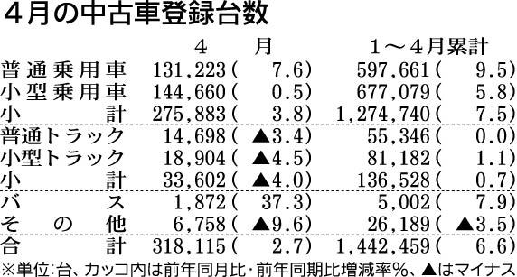 日本自動車販売協会連合会(自販連)が14日発表した4月の中古車登録台数は、前年同月比2・7%増の31万8115台となり、6カ月連続で増加した。「エコカー補助金」効果で下取り車が増え、主に中古乗用車が伸びた。6カ月連続の増加は06年10月~...