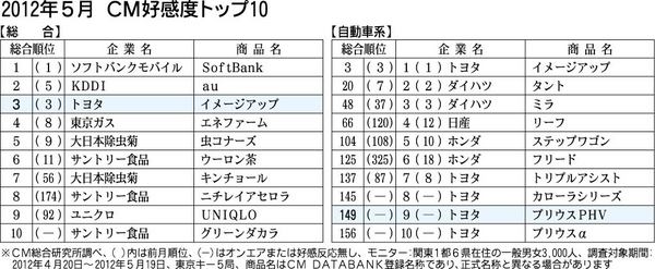 CM総合研究所(関根建男代表)がまとめた5月のCM好感度ランキングは、ソフトバンクモバイルが6カ月連続で1位となった。自動車関係ではトヨタ自動車の「イメージアップCM」が7カ月連続の首位で、総合でも先月に引き続き3位と高い好感度を得ている...
