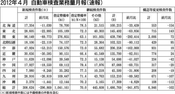 国土交通省は4月の自動車検査業務量(速報)をまとめた。全国の新規検査件数は前月比29万6869件減の30万8624件、継続検査件数は同94万1875件減の148万6769件となった。指定整備率は同0・4ポイント減の70・0%、構造等変更検...