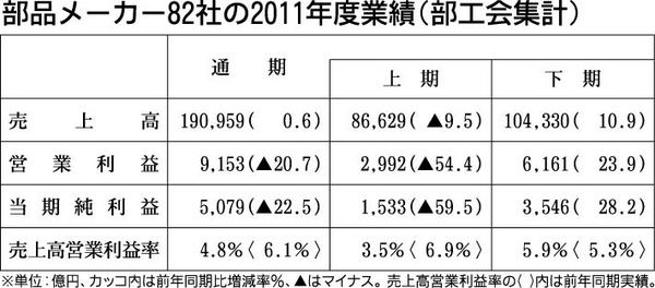 日本自動車部品工業会(部工会、会長=玉村和己ニッパツ社長)は13日「平成23年度の自動車部品工業の経営動向」を発表した。それによると、集計対象82社合計の2011年度の売上高は前期比0・6%増の19兆959億円、営業利益は同20・7%減9...