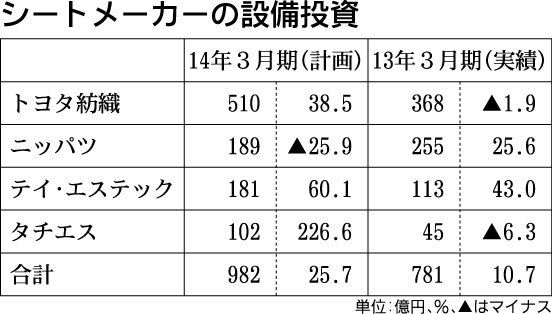 シートメーカーの2014年3月期の設備投資計画は、トヨタ紡織、ニッパツなど4社合計で982億円となり、前期に比べ25・7%増加する見通しだ。ニッパツを除く3社が増額を計画しており、主に海外での新機種立ち上げ費用、新拠点開設のための投資が増...