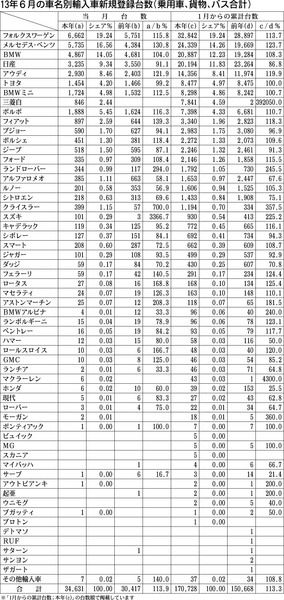 【13年6月の車名別輸入車新規登録台数(乗用車、貨物、バス合計)】