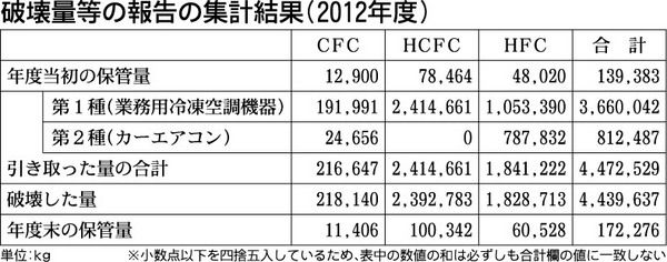 環境省は、フロン回収・破壊法に基づく2012年度のフロン類の破壊状況を公表した。同年度の破壊量は合わせて約4440トンと、前年度に比べ7・9%増加した。とくに業務用冷凍空調機器に用いられる代替フロン、HFC(ハイドロフルオロカーボン)の破...