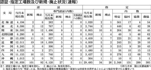 国土交通省は2013年5月末時点での認証・指定工場数及び新規・廃止状況をまとめた。認証工場数は前月比11件減の9万1939工場で2カ月連続で減少した。指定工場数は同10件増の2万9485件で増加に転じた。専門認証工場数は同77件増の612...