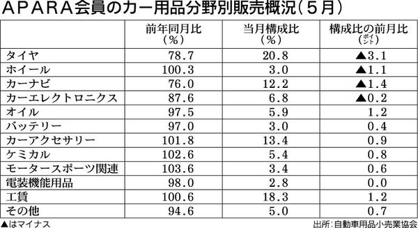 カーナビ、タイヤ伸び悩む、売上高3ヵ月ぶり減少、アクセサリーなど健闘及ばず カー用品販売店における5月の売り上げ動向をまとめた。エコカー補助金による新車効果によりアクセサリー関連などの売れ行きは伸長したものの、タイヤやカーナビが伸び悩み、売...