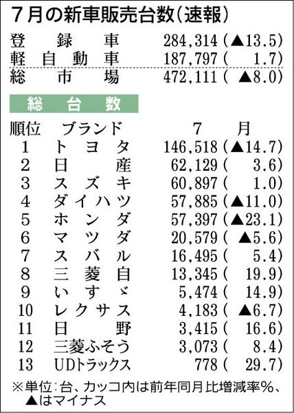 日本自動車販売協会連合会(自販連)と全国軽自動車協会連合会が1日発表した2013年7月の新車販売台数は前年同月比8・0%減の47万2111台となり3カ月連続で減少した。軽自動車は2年連続で7月単月の過去最高を更新し好調だったが、登録車は小...