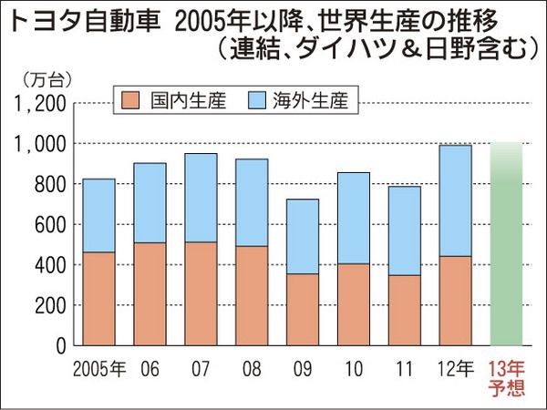 トヨタ自動車が2013年の生産計画を上方修正した。世界生産(連結)を従来計画に対して18万台増の1012万台に引き上げた。昨年に続き、世界の自動車メーカーとして初の1千万台越えに挑むことになる。「台数や収益は追わない」(豊田章男社長)とい...