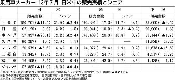 日本の乗用車メーカーによる2013年7月の日本、米国、中国における販売実績がまとまった。国内はエコカー補助金の反動減が大きかったメーカーが前年実績を大幅に下回った。その一方で、軽自動車や輸入車の好調が続いている。米国では市場回復の波に乗っ...