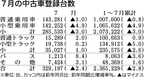 日本自動車販売協会連合会(自販連)が12日発表した2013年7月の中古車登録台数(新規・移転・変更・手続きの合算値)は、前年同月比2・4%減の32万9197台で、3カ月連続でマイナスとなった。7月としては1978年の統計開始以来、3番目に...