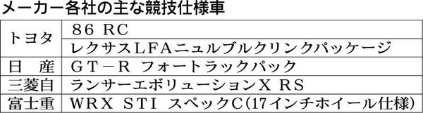 乗用車メーカー各社で、レース仕様車を市販する動きが広がっている。トヨタ自動車は後輪駆動スポーツ車「86(ハチロク)」で、未塗装バンパーやエアコンレスなどにより軽量化を図った「RC」を今春から販売している。富士重工業では高性能車「WRX S...