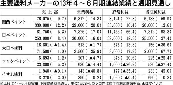 国内主要塗料メーカー5社の2013年4~6月期連結業績がまとまった。上位2社は、自動車販売が拡大するタイを始めとする海外での業績が好調だったことから増収増益となった。国内を中心とする3社は売り上げがほぼ横ばいだったが、円安による原材料の高...