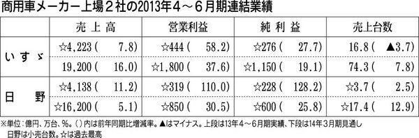 ◆4~6月期 為替効果大きく 商用車メーカーの業績拡大が加速している。上場メーカー2社(いすゞ自動車、日野自動車)の2013年4~6月期連結業績は、売上高と各利益項目が過去最高の水準となった。長年、各社の業績拡大に水を差してきた円高が是正...