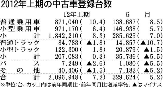 日本自動車販売協会連合会(守川正博会長)が11日発表した2012年上期(1~6月)の中古車登録台数は前年同期比7・2%増の209万6948台だった。エコカー補助金に伴う新車販売の増加で下取り車が増えた。上期が前年同期比でプラスになったのは...