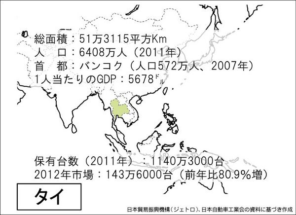 ■エコカー需要急拡大◆2012年に新車138万台 東南アジア地域への車両輸出拠点として、自動車メーカー各社の増産が続くタイ。2012年は前年比68%増の245万台を生産し、世界第10位の自動車生産国となった。世界生産の戦略拠点としての役割が...