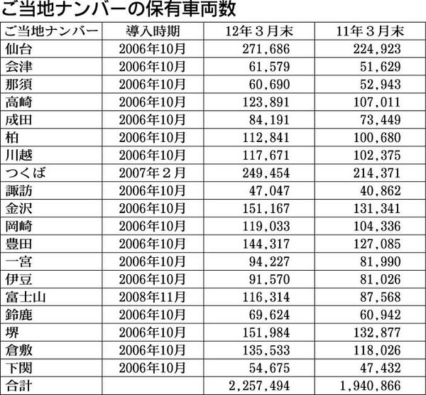 国土交通省がまとめた2012年3月末現在の「ご当地ナンバー」保有車両数(登録車)が225万7494台となり200万台の大台を突破した。最も多いナンバーは「仙台」の約27万台、次いで「つくば」の約25万台となった。11年3月末と比べご当地ナ...