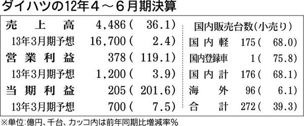 ダイハツ工業は27日、2012年4~6月期の連結業績を発表した。国内でエコカー補助金や減・免税効果により販売が好調だったことに加え、インドネシア事業の好調などもあり売上高、各利益ともに第1四半期としては過去最高の業績となった。秋以降、エコ...