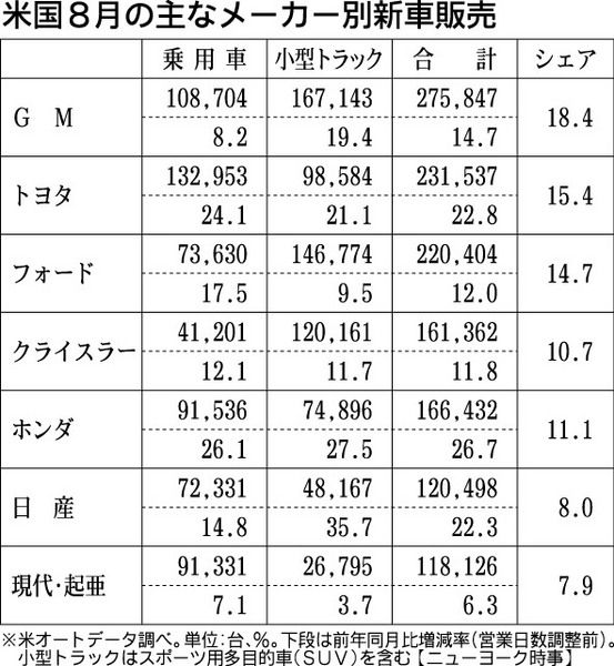 8月の米国の新車販売台数が前年同月比17%増の150万3151台となり、8月としては2003年以来、10年ぶりの高水準を記録した。全ての月を通じても07年5月以来の台数となった。雇用市場の改善を受けてマイカーを買い替える人が増え、小型車か...