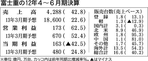 富士重工業は3日、2012年4~6月期連結決算を発表した。世界販売台数が第1四半期として過去最高となるなど全市場が好調に推移したことなどから、売上高は前年同期比42・8%増となる4288億円となった。2年ぶりの増収で第1四半期としては過去...