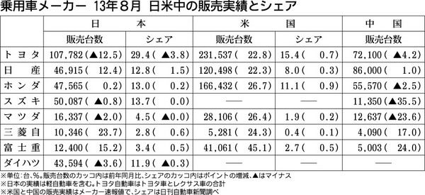 日本の乗用車メーカーによる2013年8月の日本、米国、中国における販売実績がまとまった。好調な米国市場では各社そろって市場を上回る2割以上の伸びを示したのが目立っている。日本では軽自動車が好調だったのに加え、前年割れしている登録車も回復基...