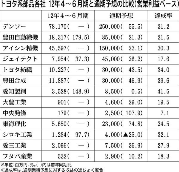 2012年4~6月期連結決算で順調に業績を回復したトヨタ系部品各社。13年3月期通期の業績予想に対して13社中7社が約3割の営業利益を確保したが、トヨタ自動車が今秋から日本国内で減産を見込んでいる。現在、トヨタの足元の生産水準は日当たり1...