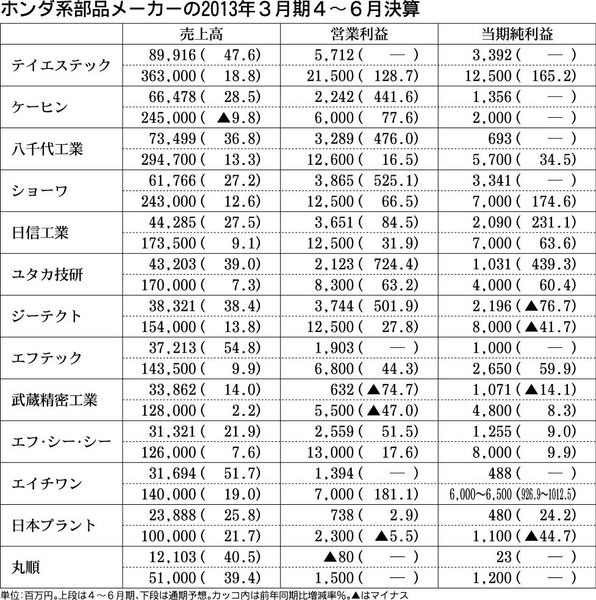 ホンダ系部品メーカー13社の2013年3月期4~6月期決算は、震災で収益が大きく落ち込んだ前年同期に比べ大幅な増収増益になった。国内のエコカー補助金や北米での需要回復もあり、ほとんどの企業が増収増益を確保した。北米での受注増を背景に4社が...