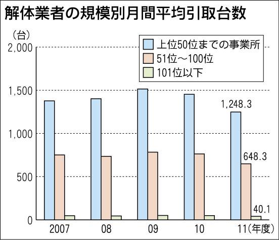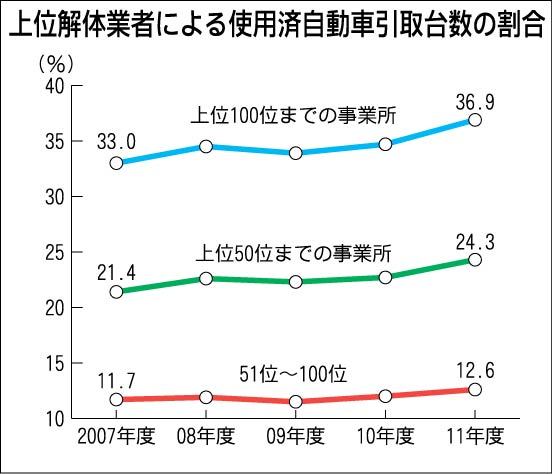使用済み自動車の発生量減少と並行して、使用済み自動車が大手解体業者に集中する流れが鮮明になってきた。従来から規模の格差が大きい業界であることが指摘されてきたが、使用済み自動車取り扱い台数上位100位までの解体業者の事業所による取り扱い台数...