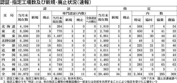 国土交通省は2013年7月末時点での認証・指定工場数及び新規・廃止状況をまとめた。認証工場数は、前月比39件増の9万1972工場で増加に転じた。指定工場数は前月と同じ2万9493工場。専門認証工場は同59件減の6086工場となり62カ月ぶ...