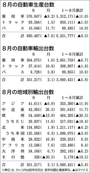日本自動車工業会(自工会、豊田章男会長)は30日、8月の国内生産実績を発表した。台数は前年同月比7・6%減の68万487台となり、12カ月連続で減少した。乗用車は12カ月連続のマイナスだった。好調な新車販売が続く軽四輪車が8月単月として過...