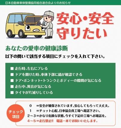 日本自動車車体整備協同組合連合会(日車協連、馬場茂会長)は、自動車車体整備事業認証制度の創設を視野に入れた活動の一環として、エンドユーザーに向けた広報活動を開始する。 第1弾として、愛車の健康診断を促すチラシ「安心・安全編」を作成。エンド...