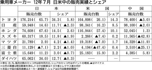 日本の乗用車メーカー8社による2012年7月の日米中販売台数がまとまった。米国市場全体は前年同月比8・9%の増加だったが、その中で日本メーカーは昨年の震災影響からの立ち直りもあり、トヨタ自動車と日産自動車、ホンダ、富士重工業が大幅な増加を...