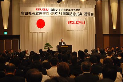 【山形】山形いすゞ(會田幸憲社長)は11日、ホテルメトロポリタン山形で「會田社長就任並びに創立61周年記念式典」を開催した。式典には同社社員のほか、来賓にいすゞの月岡良三取締役副社長、橋本秀樹取締役営業本部長、原田理志常務執行役員、川幡進...