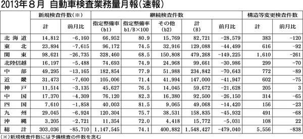8月自動車検査業務量、新規・継続・構造変更検査件数とも減