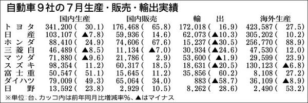 乗用車メーカー8社は29日、2012年7月の生産、販売、輸出実績を発表した。国内生産では足元のエコカー補助金などの効果による好調な国内販売や、昨年7月で一部に残っていた東日本大震災による影響からの反動増もあり、日産自動車と三菱自動車、マツ...