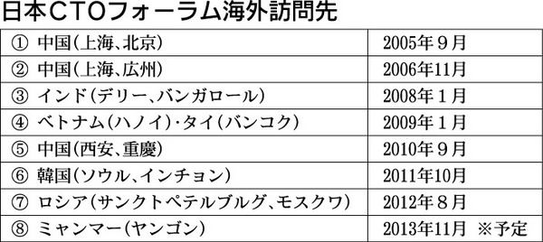 日本CTOフォーラムでは、2004年に発足以来、毎期1回は海外に出かけ、現地のR&D関係者と交流、親睦を深めている。これまでの過去7期の海外訪問先は別表の通り。ご覧のようにアジア諸国、とりわけ中国が多く、その時期の旬のスポットをめがけて訪...