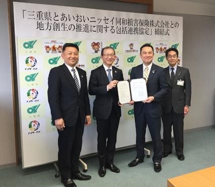 【津】あいおいニッセイ同和損害保険は14日、三重県と「地方創生の推進に関する包括連携協定」の締結式を行った。県から鈴木英敬知事と西城昭二戦略企画部長、同社からは長島宏司副社長と神戸忠男三重支店長が出席した。同社は地方創生の取り組みの一層の...