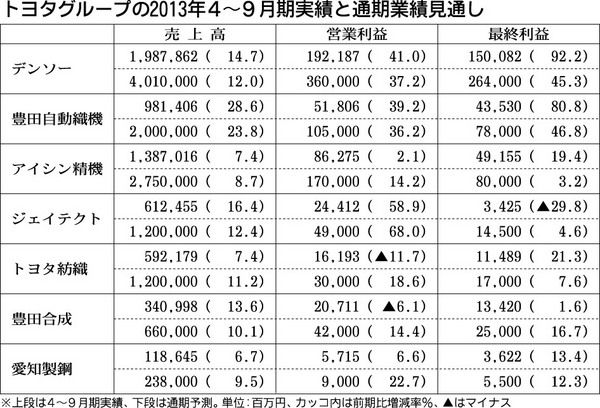 トヨタ系大手部品各社は10月31日、2014年3月期(通期)の業績予想を修正して発表した。為替相場が円安で安定し、日米市場が堅調に推移している点を反映したもので、愛知製鋼を除く6社が上方修正した。13年4~9月期業績はトヨタ紡織、豊田合成...