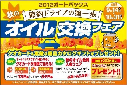 オートバックスセブンは、エンジンオイルの販売促進キャンペーン「2012オートバックス秋のオイル交換フェア」を開始した。期間は10月31日まで。 同キャンペーンはエンジンオイル購入者を対象に、応募者の中から抽選で50人に1万円分、300人に...