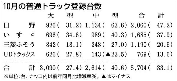 業界筋がまとめた10月の普通トラック(積載量4トン以上)販売は前年同月比33・1%増の5704台で、4カ月連続のプラスとなった。大型車は同27・4%増で全メーカーがプラス、中型車は同40・6%増でUDトラックスの除く3社が増加した。昨年7...