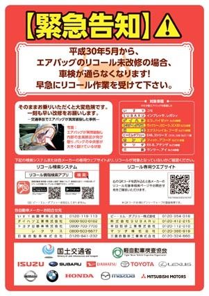 国土交通省中部運輸局(石澤龍彦局長)は、5月からタカタ製エアバッグ装着車両のリコール未改修車両を車検で通さない措置について、自動車ユーザーの認知度を徹底するためのポスター(B2サイズ)を1千枚作成する。同運輸局管内(愛知、静岡、岐阜、三重...