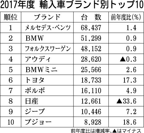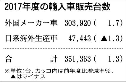 2017年度の外国メーカー車の新規登録台数は前年度比1・7%増の30万3920台となり、3年連続のプラスとなった。年度としては過去2番目の実績で、登録車全体に占める外国メーカー車比率9・1%は過去最高だった。ブランド別では、メルセデス・ベ...