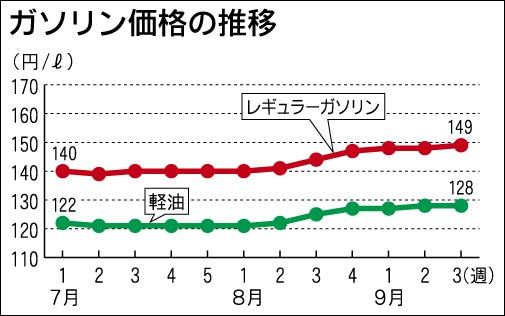 資源エネルギー庁の石油製品市況動向調査によると、レギュラーガソリン1リットル当たりの店頭価格(18日時点)の全国平均は、前週比0・5円高の148・7円と6週連続で値上がりした。原油高による仕入れ価格上昇を転嫁し切れていない販売店も多く、小...