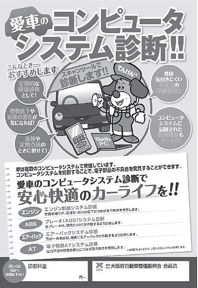 大阪府自動車整備振興会(山本昇会長)は、スキャンツール(外部故障診断器)を活用した「コンピュータシステム診断」をメニュー化し、ユーザーに対する「診断」の周知と有料化を目指す取り組みを強化する。コンピューター診断を勧めるポスターや、診断のメ...
